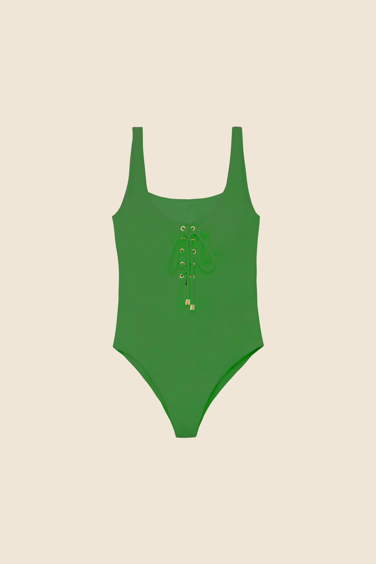 The Grace Palm Tie Swimsuit features a timeless, feminine silhouette with a flattering scoop neckline and wide shoulder straps for comfort and support. The front lace-up detail is finished with polished metal eyelets and matching cord tips, adding a touch of sophistication. Crafted from a soft fabric with a tactile feel, it offers a high-cut leg and structured fit that beautifully contours the body—blending elegance and ease for summer retreats.